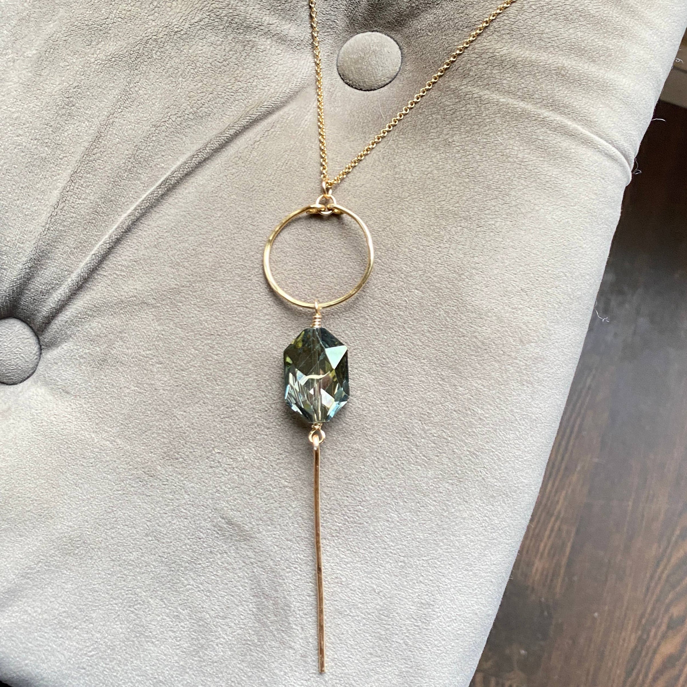 Handcrafted and hammered gold plated hoop and bar necklace. The crystal is 25mm x 18mm. The entire pendant is 4.5" long. The gold plated wire that is used for this necklace is tarnish resistant. I also seal it again with a sealant for extra protection. This necklace is also available in silver. It has a 18" gold plated chain with a gold plated lobster clasp. This gorgeous crystal is faceted to catch the light in all directions. Crysstal is also available in Blue crystal.
