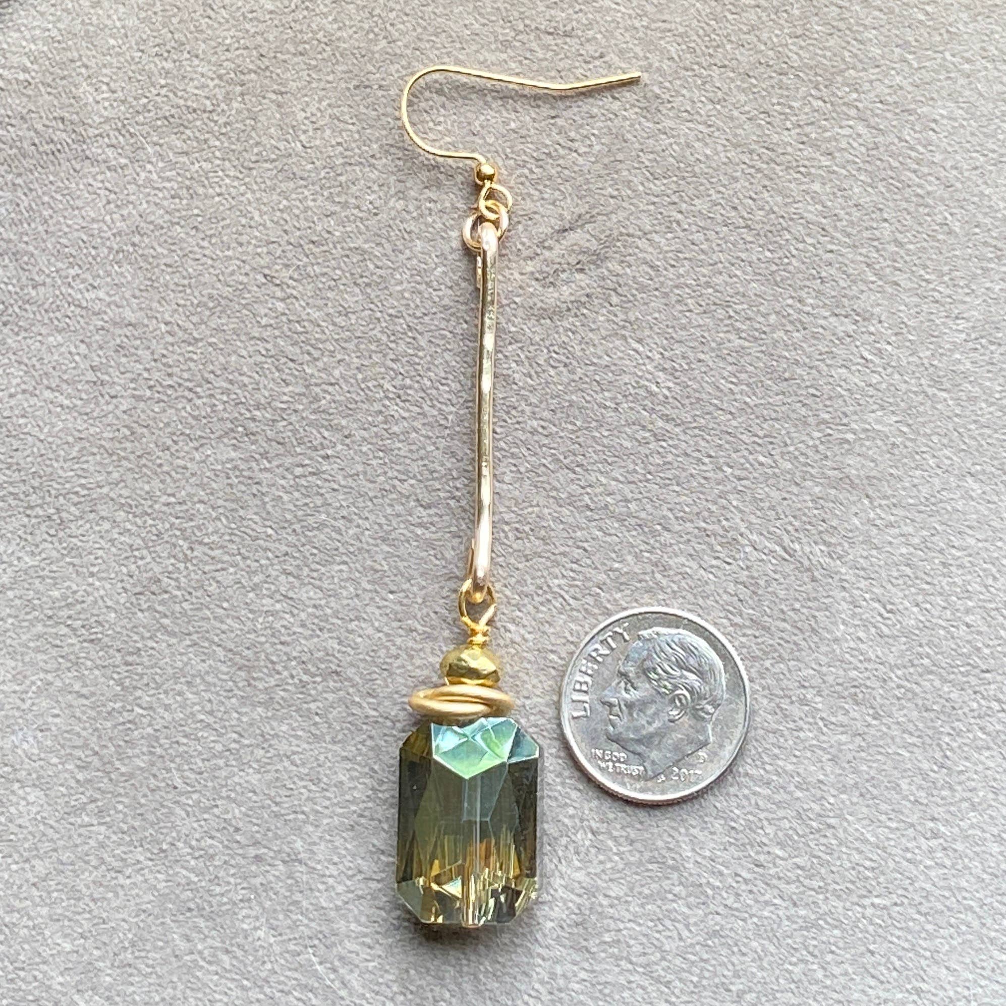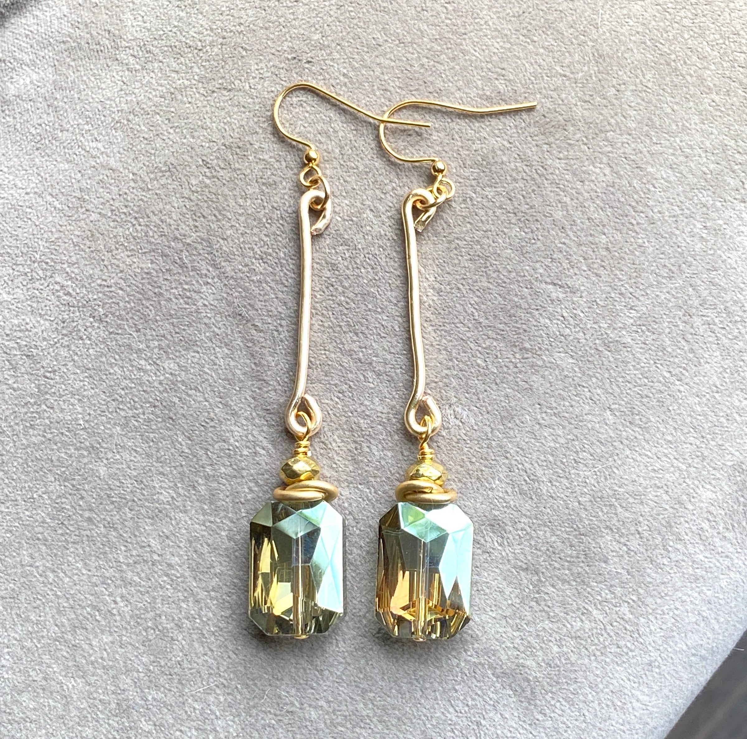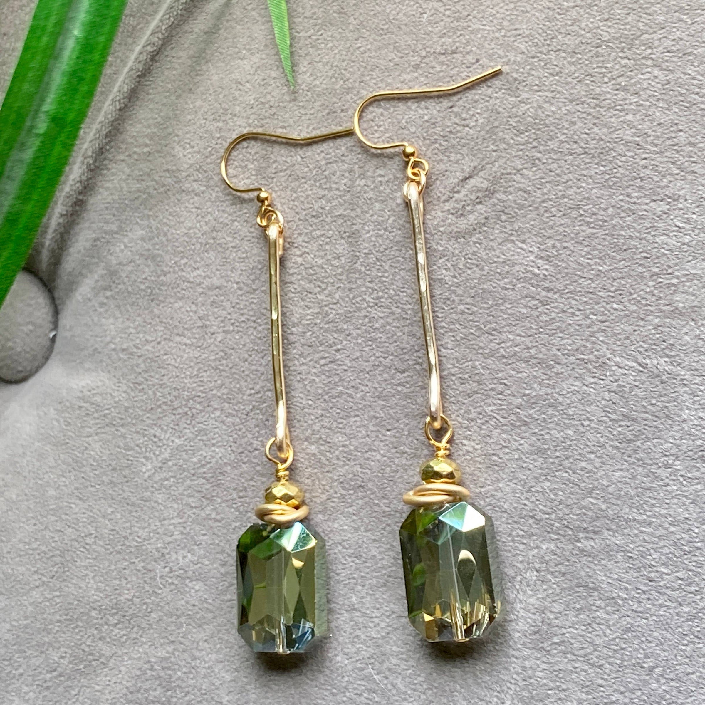 Beautiful and bold are these earrings. Using a tarnish resistant gold 14 gauge wire, the metal is hand forged and hammered to create a drop bar for these gorgeous crystals. The crystals are a faceted olive green. They catch the light in all directions, they measure18mm x 13mm and the earrings are 3.25" in length starting at the top of the ear wire. Gold plated ear wires.