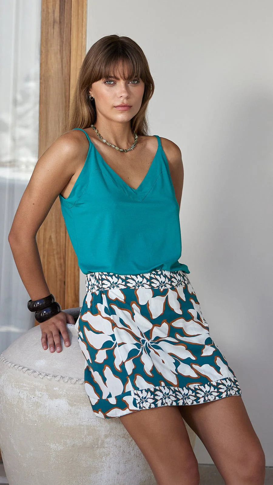 Fun, flirty, and easy to move in—the Begonia Skirt puts a playful spin to any outfit. Its wide-cut shape creates soft volume, while the elasticized back offers a comfortable fit that sits securely. Designed in our newest bloomcrest and bloomtide petrol floral print, it pairs beautifully with the Adora Top for a matching set that makes an entrance.
